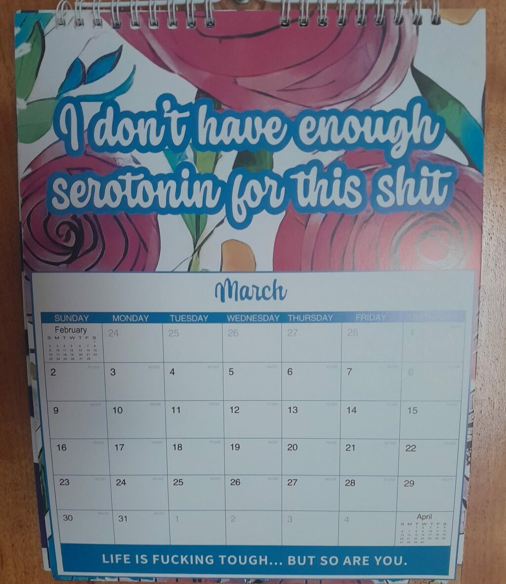 Hey everyone, I hope you’re all well and good and have had an amazing weekend. Today I bring the 3rd instalment of my calender. I don’t have enough serotonin for this shit. My Mrs thinks this is funny, and totally agrees with it. She explained to me that as she’s suffered with depression from a…